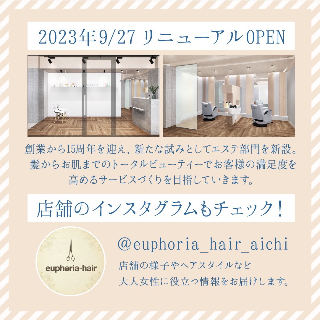 【euphoria】はギリシャ語で【幸福感】です。「お客様・スタッフが幸せに、優しい気持ちになれるように」という願いを込めました! スタッフが永く、美容業界に携われるサロンづくりを目指しています! 思いやりに溢れた接客と、一人ひとりのお客様にオンリーワンなスタイル・デザインの提案をしませんか♪ 主婦(夫)の方、お子様がいらっしゃる方も美容師の仕事がしたい!という気持ちがあれば働いていただける環境を整えています☆パート勤務はもちろん、準社員という拘束時間は短いけれども正社員として働ける制度があるんです!準社員希望の方もまずは応募してくださいね。また、社内外での講習にも参加しているので、経験の浅い方やアシスタントからスタートを望む方にも嬉しい環境を用意しています。永く、美容業界に携われるサロンで働きませんか♪ 気になった方はまずご応募ください!!!