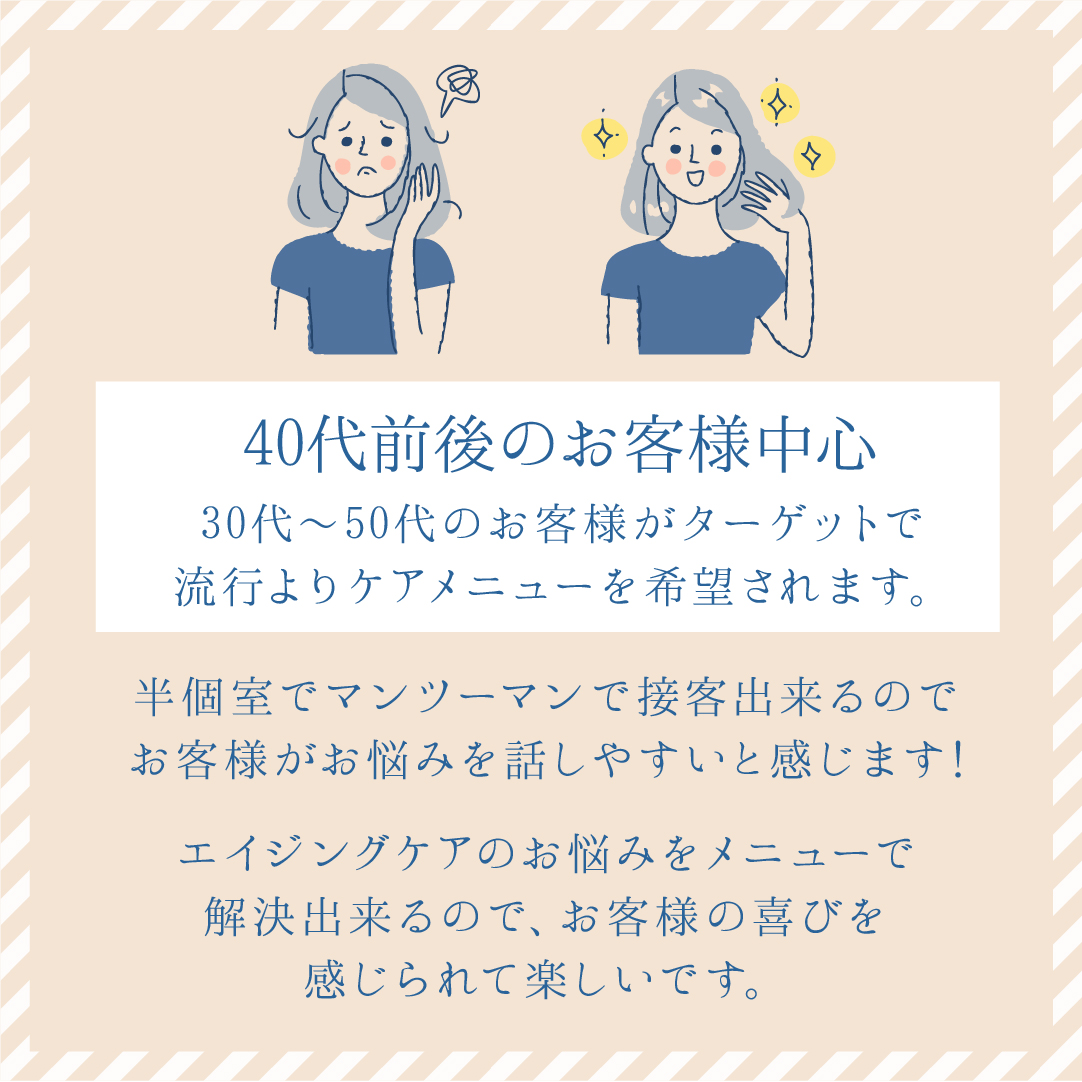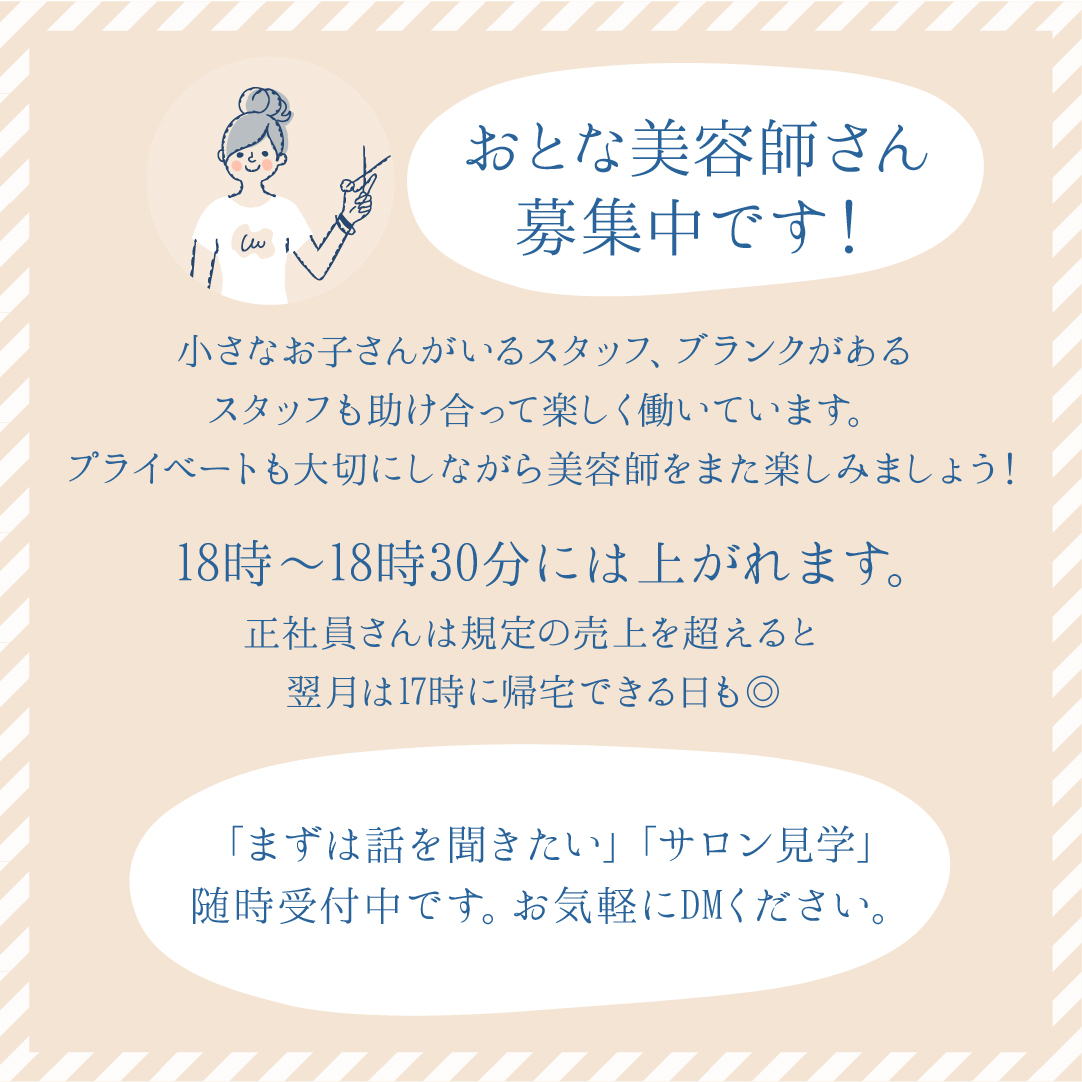 | 歩合内容 | ・技術売上(フリー)36~38%(基本給20万円の方 技術売上65万円以上~ 36%~歩合対象となります) ・店販売上0~10%(店販手当 商品売上2万円以上 例)5万×10%=5,000円) |